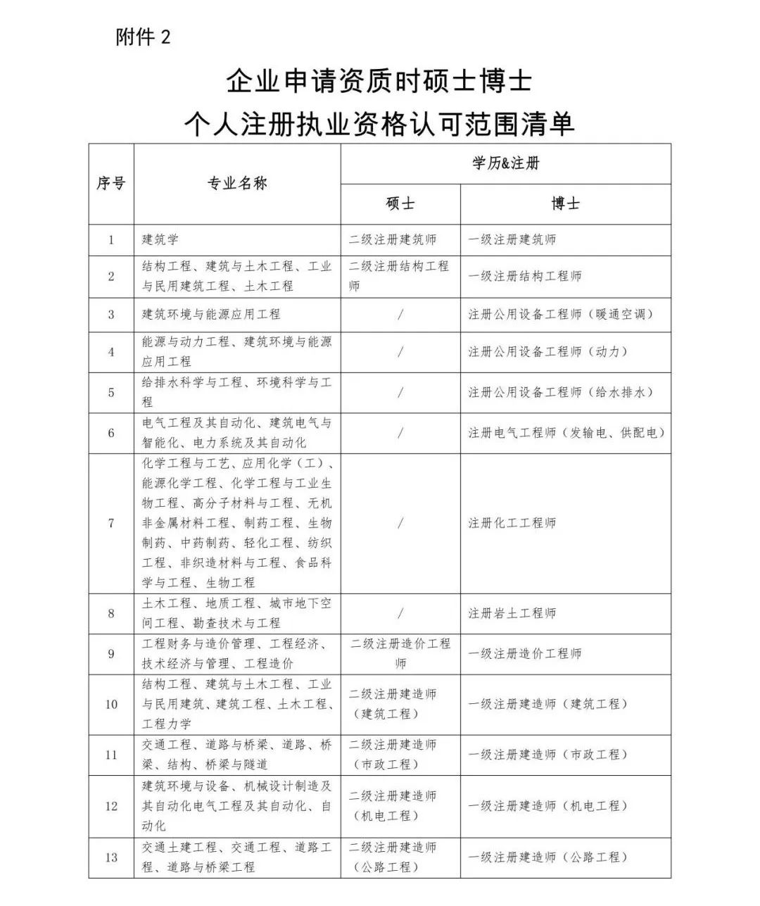 2. 企业申请资质时硕士博士个人资格认可范围清单