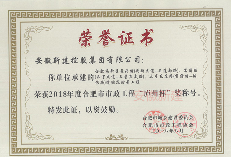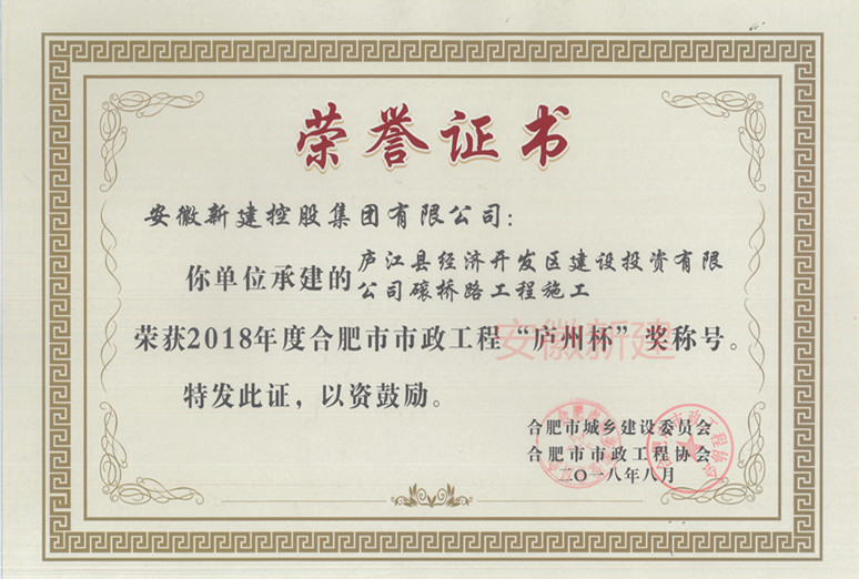 近日,合肥市必威betway西汉姆协会举办了2018年度联通会暨相关业务培训,会议表彰了2018年度合肥市必威betway西汉姆“庐州杯”奖,并现场颁发了奖项。由我公司承建的合肥高新区复兴路(创新大道-石莲南路)、菖蒲路(长宁大道-三星东支路)、三星东支路(當蒲路-铭传路)道排及附属工程与庐江县经济开发区建设投资有限公司磙桥路工程施工获此殊荣。