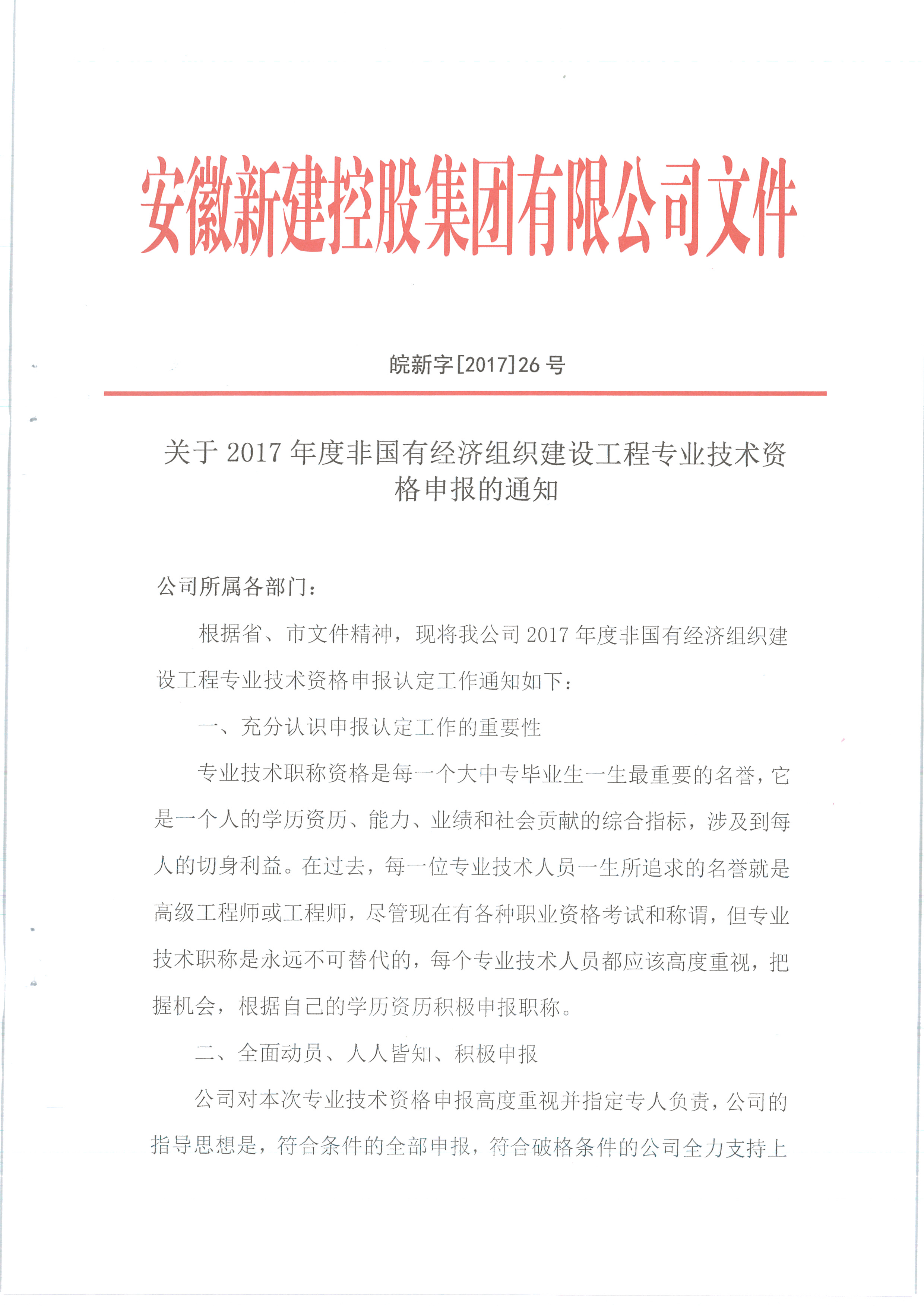 关于2017年度非国有经济组织建设工程专业技术资格申报的通知