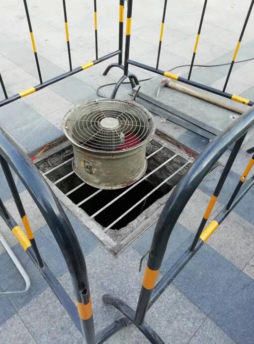 1、进入暗渠作业前,提前1小时采用轴流风机强制通风,把新鲜的空气通过检查井送至工作地点,把原箱涵里面可能存在的有害气体排干净。如下图: