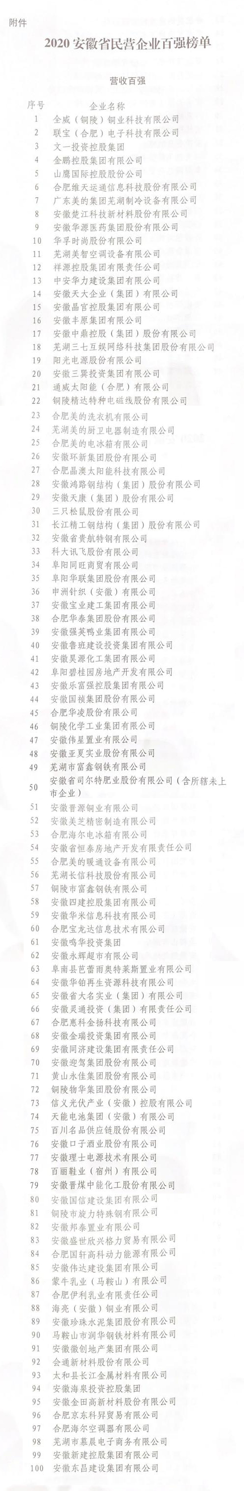 据人民网安徽频道最新消息,8月13日上午,安徽省工商联、安徽省经信厅、安徽省市场监管局联合发布2020安徽省民营企业百强(营收)榜单。必威betway再次进入榜单。