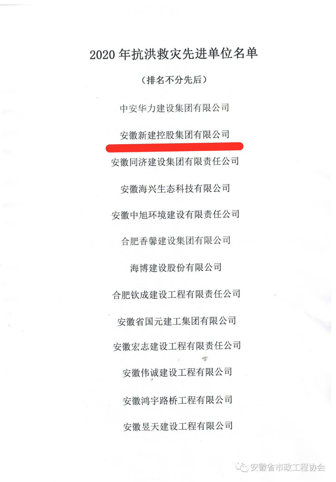 8月17日,安徽新建控股集团获评“2020年抗洪救灾先进单位”荣誉称号。
