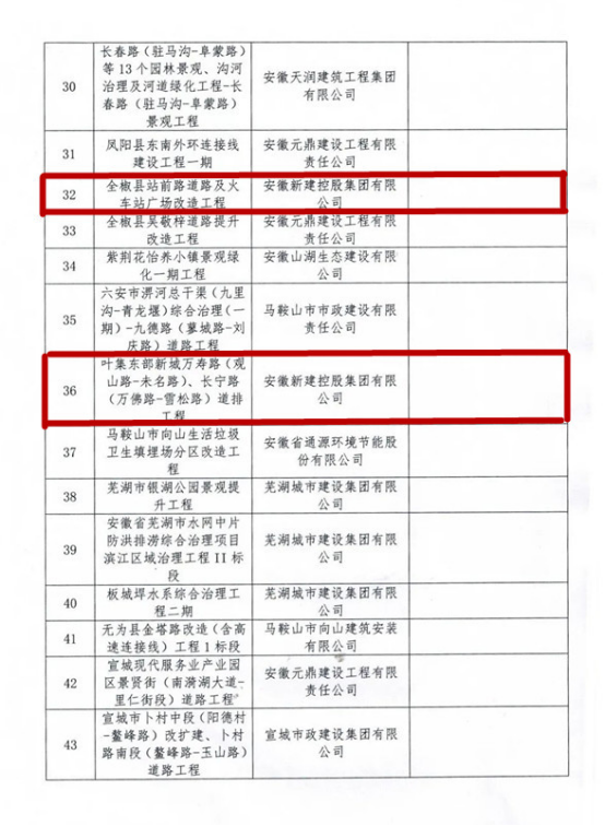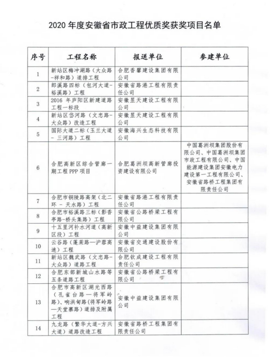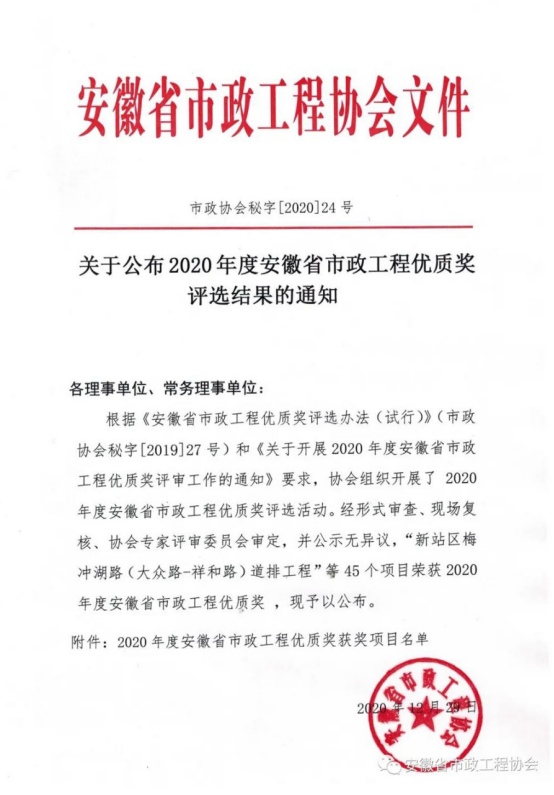 2020年12月29日,根据《安徽省必威betway西汉姆优质奖评选办法(试行)》(市政协会秘字【2019】27号)和《关于开展2020年度安徽省必威betway西汉姆优质奖评审工作的通知》要求,在协会组织开展评选活动中,经形式审查、现场复核、专家评审委员会审定,由必威betway施工的全椒县站前路道路及火车站广场改造工程、岳西县店前滨河新区店前河综合治理建设项目3标段、叶集东部新城万寿路(观山路-未名路)、长宁路(万佛路-雪松路)道排工程,三项工程荣获“2020年度安徽省必威betway西汉姆优质奖”!