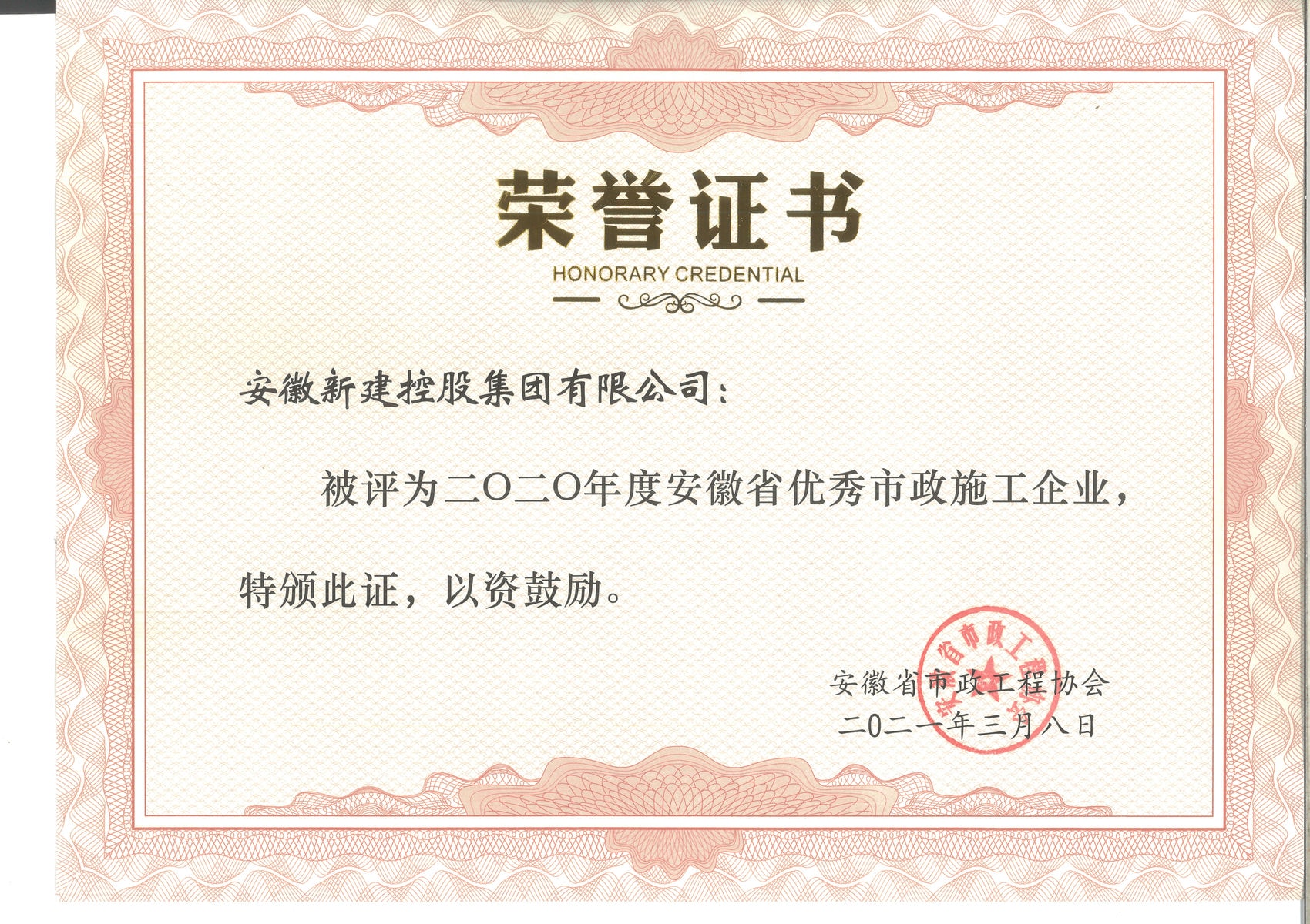 必威betway荣获2020年度“安徽省优秀市政施工企业”荣誉称号。