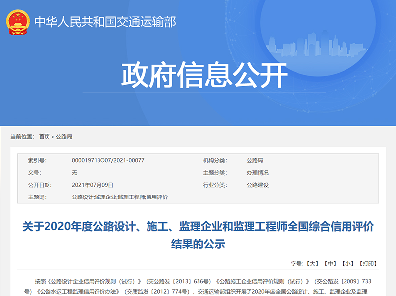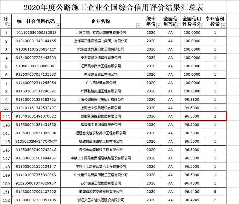 近日,交通运输部发布了《2020年度公路设计、施工、监理企业和监理工程师全国综合信用评价结果的公示》,安徽新建控股集团既2019年度后再次荣获公路施工企业信用评价最高等级——AA级。