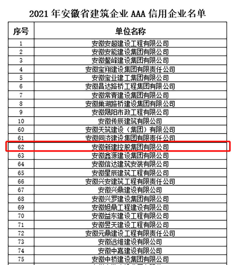 1月5日,安徽省建筑业协会分别公布了2021年安徽省建筑企业诚信典型企业、AAA信用企业评价结果,安徽新建控股集团凭借卓越的服务质量、品牌认知度和良好的社会信誉获评“安徽省建筑企业诚信典型企业”和“AAA信用企业”两项殊荣。