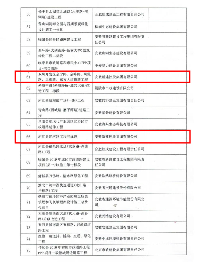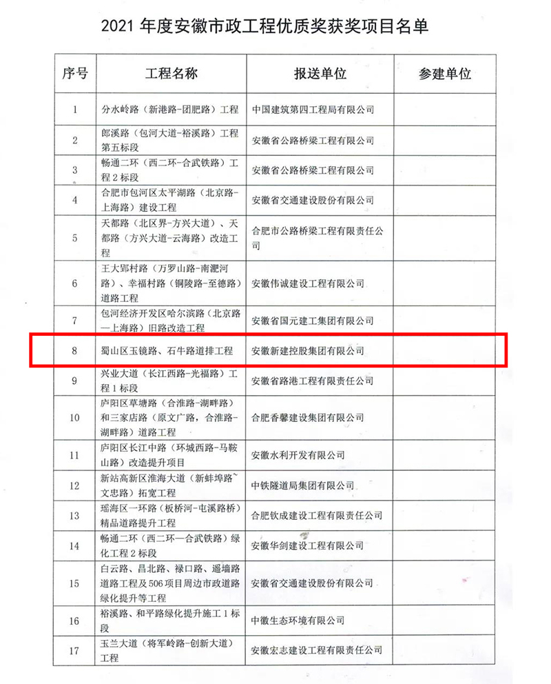 获奖的工程分别为蜀山区玉镜路、石牛路倒排工程,双凤开发区金宁路、金峰路、凤霞路、凤庆路、东方大道道路工程,庐江县泥河路工程三标段,营口市现状排水泵站改扩建工程EPC总承包项目。四项工程自开工以来,受到公司各级领导的高度关注,在日常施工过程中,公司严格按照质量管理制度要求,每周进行质量检查,严防死守,确保工程质量安全目标实现。