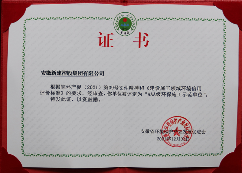 近日,经安徽省环境保护产业发展促进会综合评定并向社会公示,安徽新建控股集团顺利通过综合评审,荣获“AAA级环保施工示范单位”。