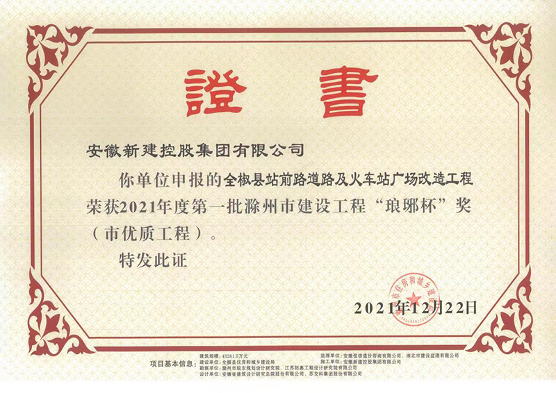 近日,集团公司收到由安徽省滁州市住房和城乡建设局颁发的证书,公司承建的全椒县站前路道路及火车站广场改造工程荣获2021年度第一批滁州市建设工程“琅琊杯”奖(市优质工程)。