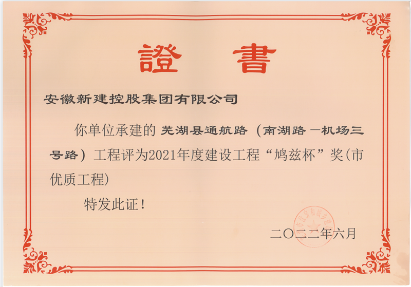近日,根据《芜湖市住房城乡建设局关于印发芜湖市建设工程“鸠兹杯”奖(市优质工程)评选表彰办法的通知》,经企业申报、专家评审、会议审定、网上公示等程序,安徽新建承建的芜湖县通航路(南湖路——机场三号路)工程荣获芜湖市建设工程“鸠兹杯”优质工程奖。