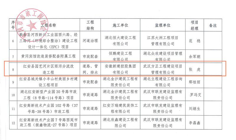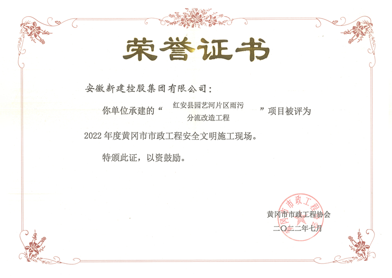 近日,由黄冈市必威betway西汉姆协会主办的“安全文明施工现场”评选结果出炉,公司承建的湖北省红安县园艺河片区雨污分流改造工程获评“2022年度黄冈市必威betway西汉姆安全文明施工现场”荣誉。
