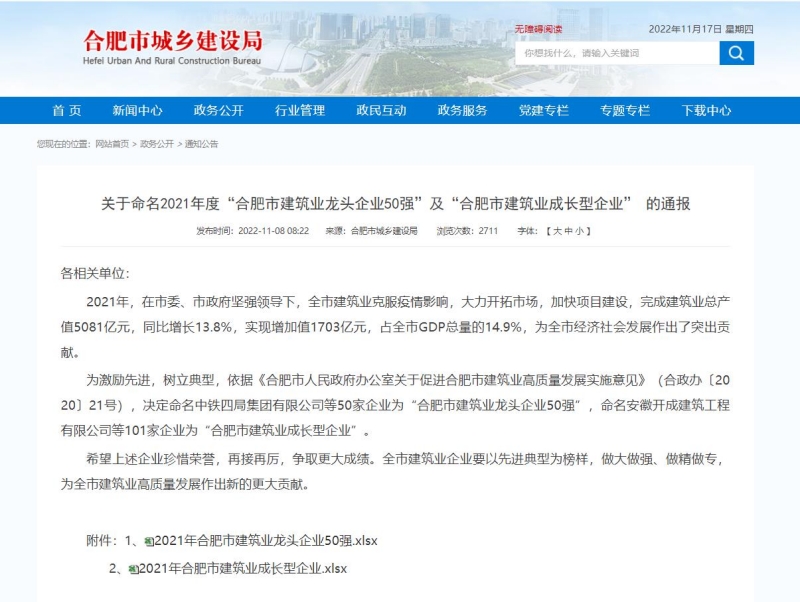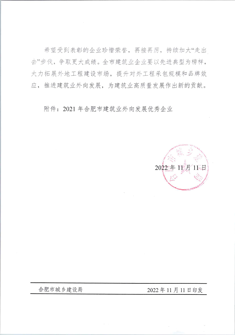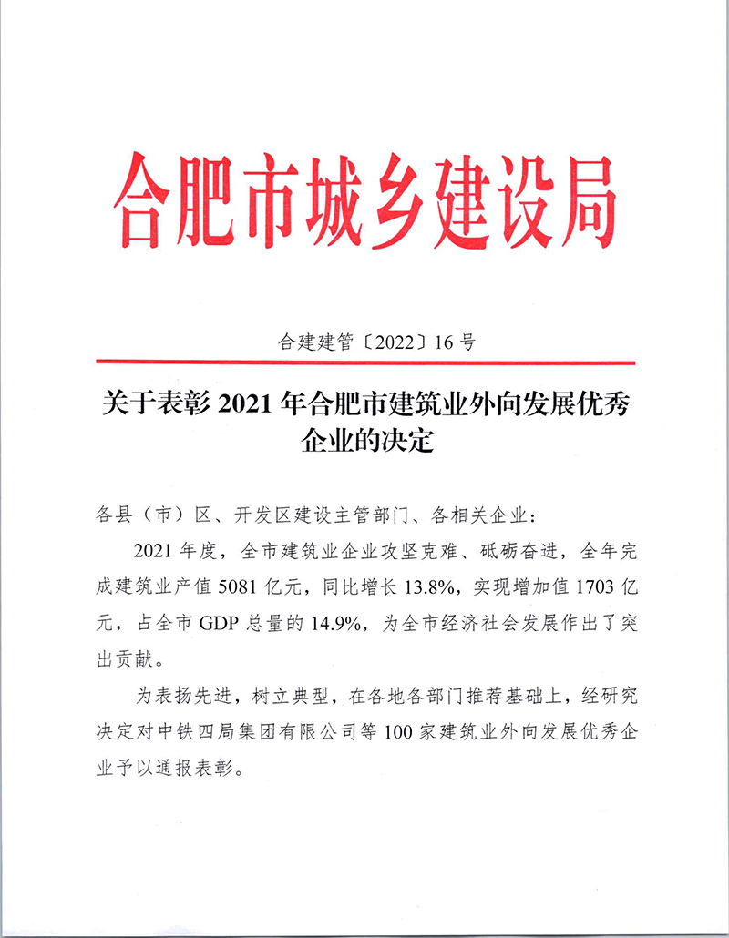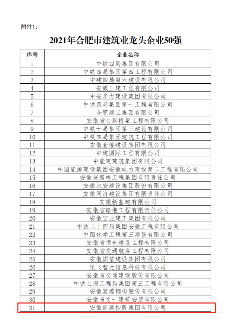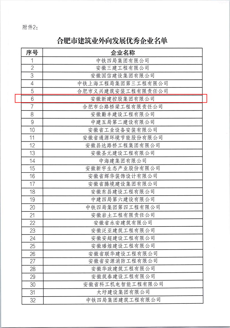 近日,合肥市城乡建设局官网通报“2021年度合肥市建筑业龙头企业50强”名单,并发文表彰“2021年合肥市建筑业外向发展优秀企业”,安徽新建再次获评2021年合肥市建筑业外向发展优秀企业,并荣登合肥市建筑业龙头企业50强榜单。