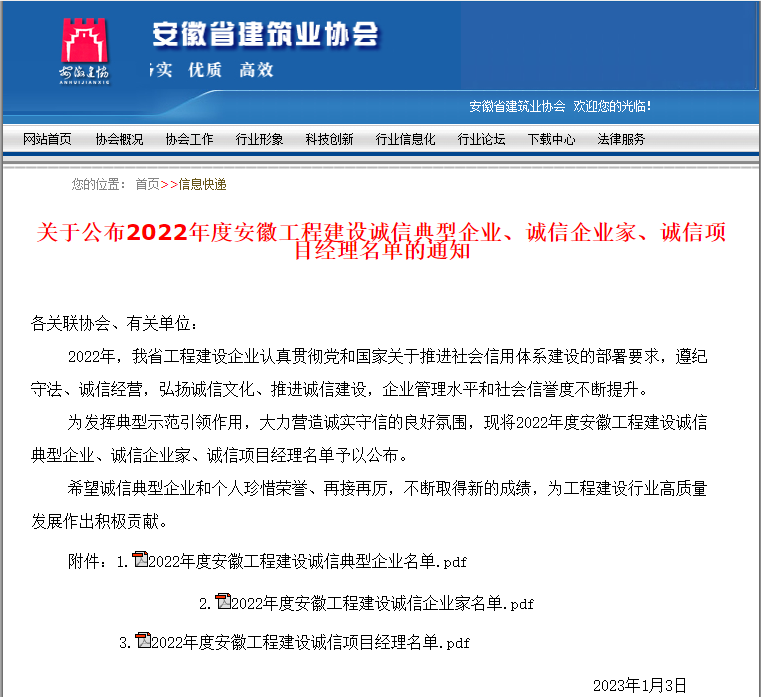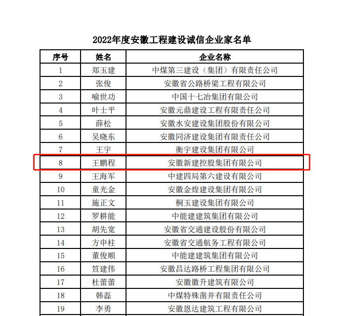 1月3日,安徽建筑业协会官网发布2022年度安徽工程建设诚信典型企业、诚信企业家、诚信项目经理名单,安徽新建控股集团荣获“2022年度安徽工程建设诚信典型企业”,公司总经理王鹏程获评“诚信企业家”,唐海运、张轲、郑理乔分获“诚信项目经理”称号。
