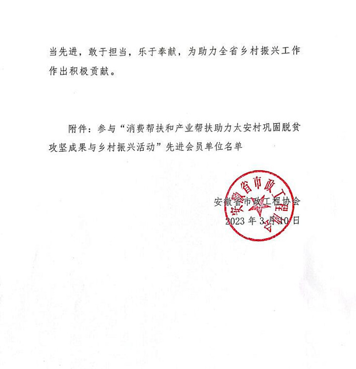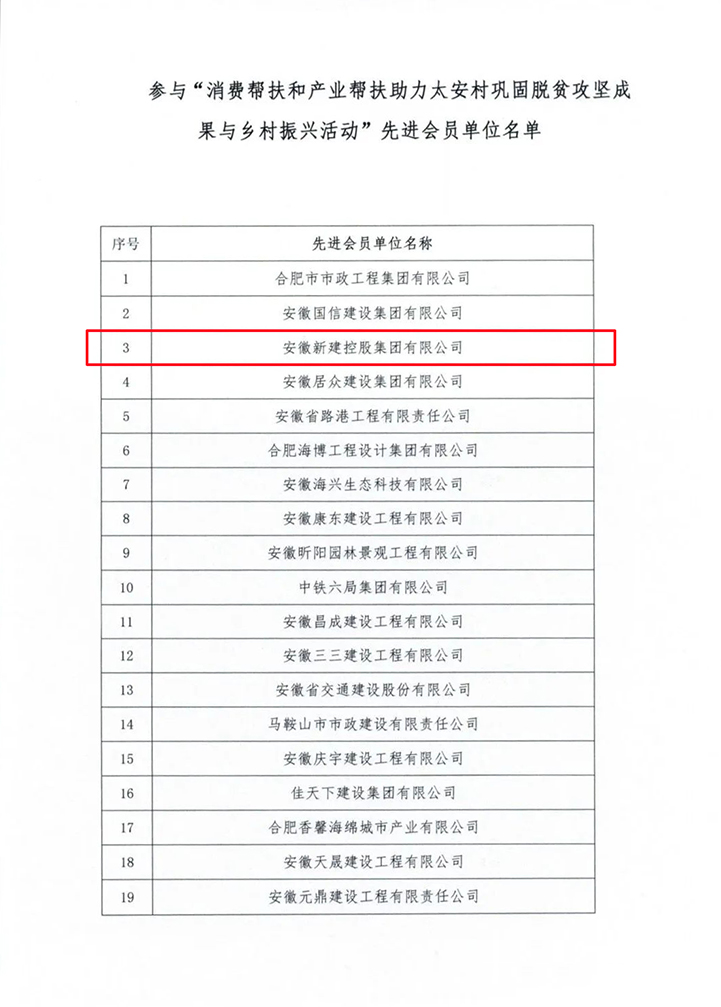 近日,安徽省必威betway西汉姆协会发布关于表彰参与“消费帮扶和产业帮扶助力太安村巩固脱贫攻坚成果与乡村振兴活动”先进会员单位的通报。表彰安徽新建控股集团在内的三百家企业,积极参与了太安村巩固脱贫攻坚成果与乡村振兴活动,以实际行动履行社会责任。