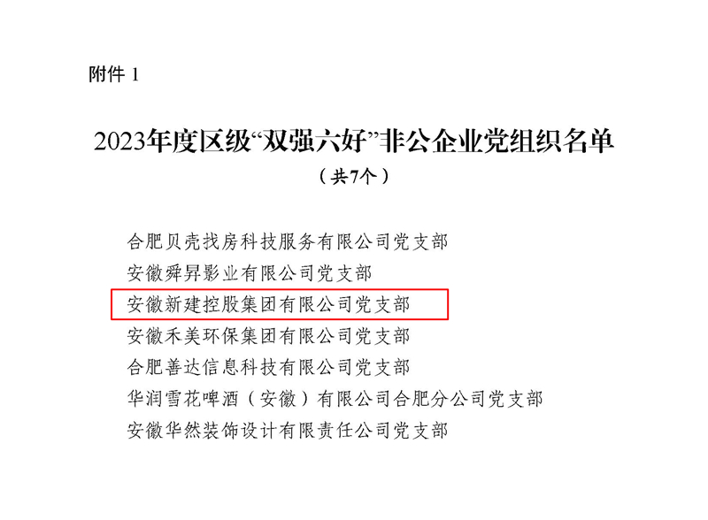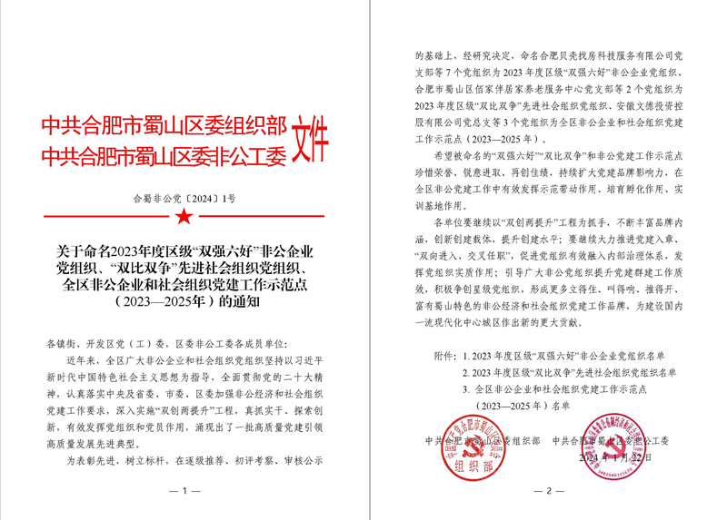 1月22日,中共合肥市蜀山区委组织部、中共合肥市蜀山区委非公工委联合发文,命名2023年度区级“双强六好”非公企业党组织、“双比双争”先进社会组织党组织和全区非公企业和社会组织党建工作示范点,集团公司党支部作为先进典型,以及在非公党建工作中发挥的示范引领作用,被授予2023年度蜀山区“双强六好”非公企业党组织荣誉称号。