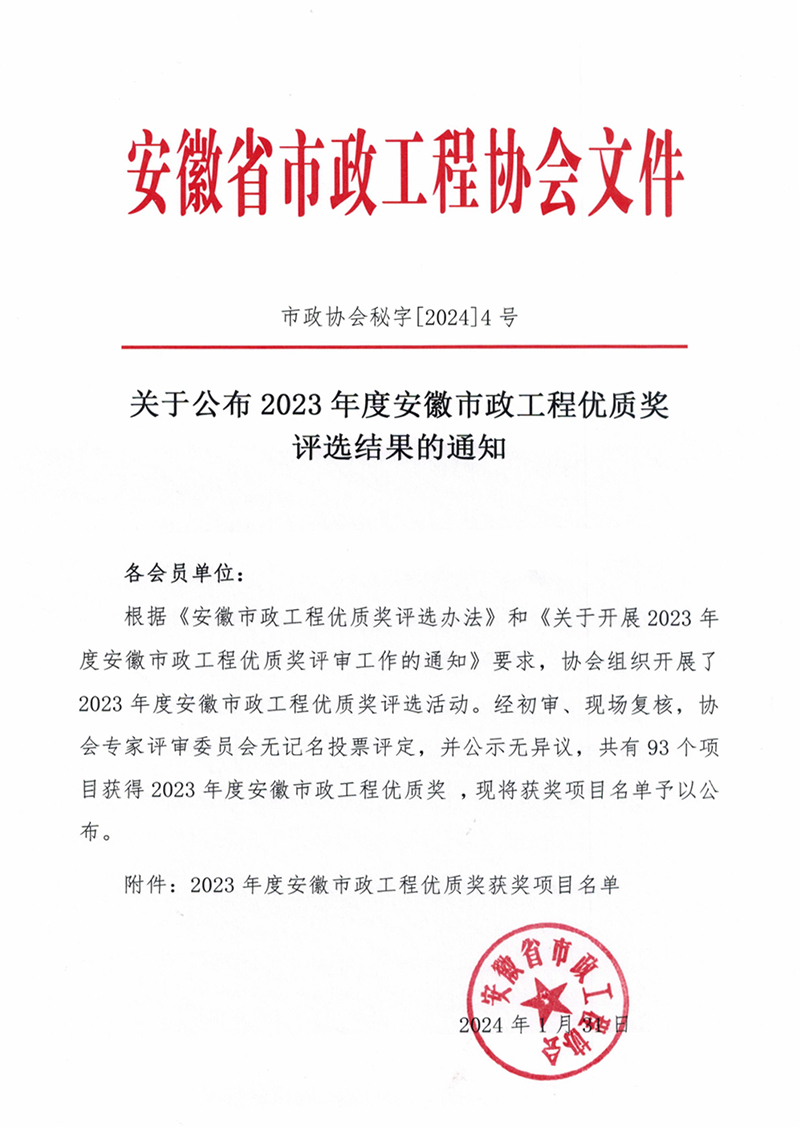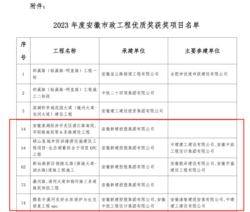 1月31日,安徽省必威betway西汉姆协会公布关于“2023年度安徽省必威betway西汉姆优质奖”评选结果的通知,集团公司承建的安徽巢湖经济开发区渡江路南延、华阳路南延等6条路建设工程、砀山县城市防洪排涝设施建设工程项目-生态调蓄综合子项目EPC工程、新站高新区铜陵北路(淮海大道泗水路)道路工程施工、濠州路、淮河大道和郭圩路三条道路延伸段工程、黟县丰溪河良好水体保护与生态修复工程epc等5项工程荣获2023年度安徽省必威betway西汉姆优质奖奖项。