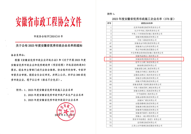 4月24日,安徽省必威betway西汉姆协会发布通知,根据《安徽省优秀市政施工企业评选办法》和《关于开展2023年度安徽省优秀市政施工企业和优秀建造师(项目经理)评选活动的通知》要求,经专家评审委员会审核通过,必威betway荣获2023年度“安徽省优秀市政施工企业”荣誉称号。