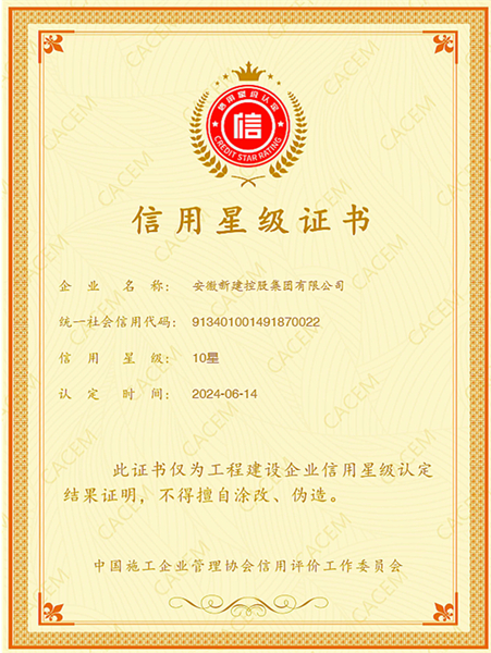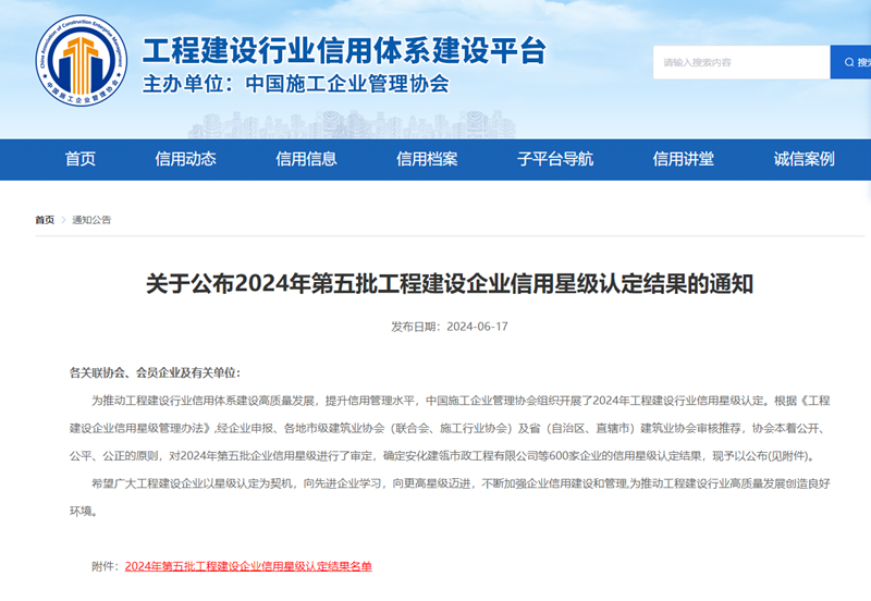 6月17日,中国施工企业管理协会公布2024年度第五批工程建设企业星级认定结果,在全国第五批参加认定的600家企业中,安徽新建凭借良好的企业履约行为和信用表现,获得信用星级十星认定。