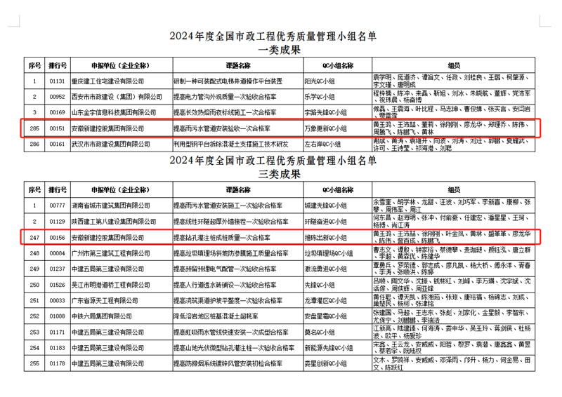 近日,中国必威betway西汉姆协会公布了2024年度全国必威betway西汉姆优秀质量管理小组名单,集团公司万象更新QC小组申报的《提高雨污水管道安装验收一次合格率》荣获一类成果;推陈出新QC小组申报的《提高钻孔灌注桩成桩质量一次合格率》荣获三类成果。