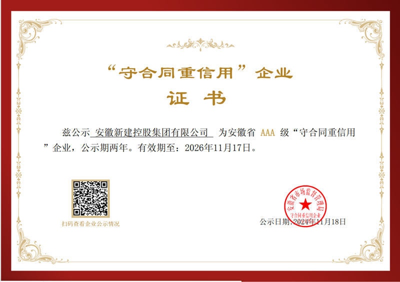 11月18日,安徽省市场监督管理局正式公布关于“安徽省守合同重信用企业名单”,集团公司获得颁发安徽省AAA级“守合同重信用”企业荣誉证书。