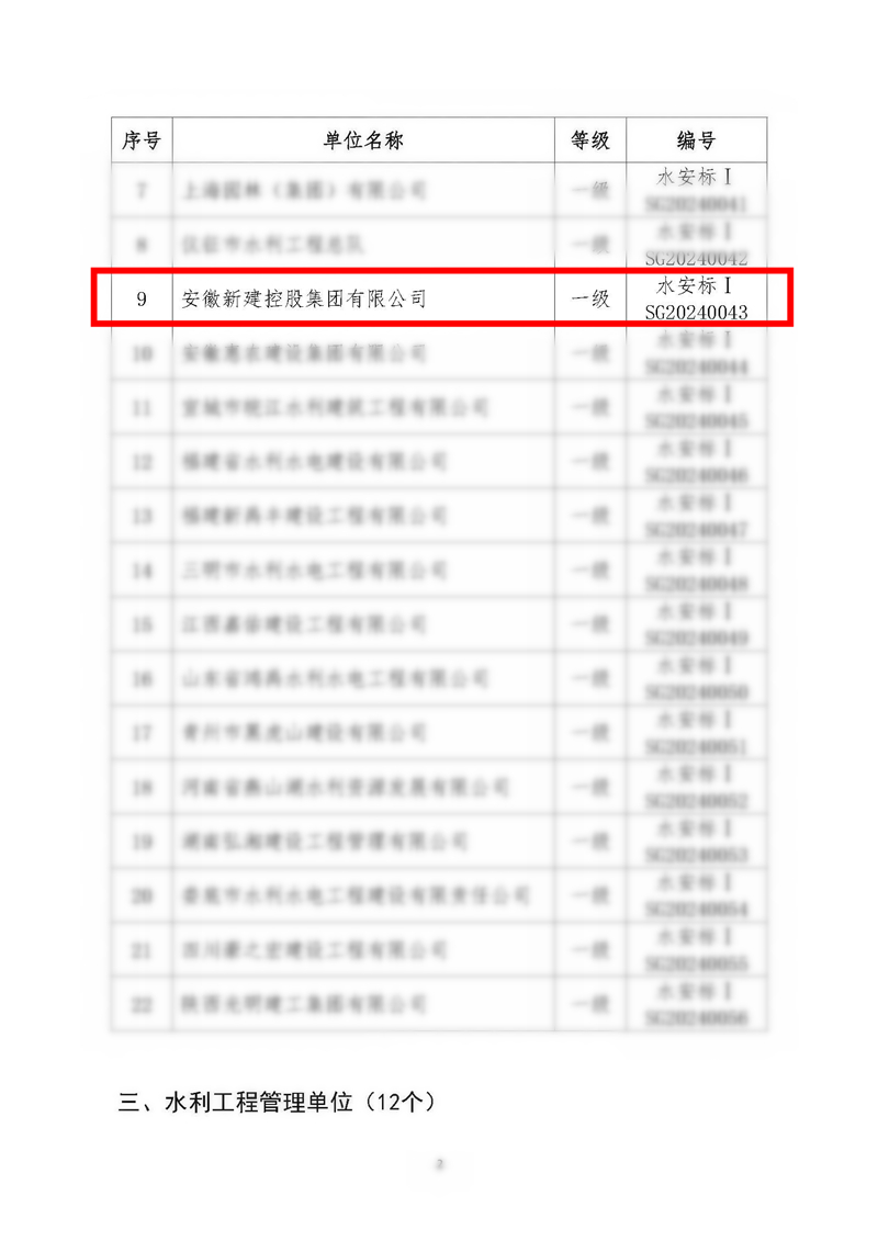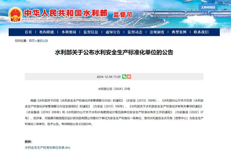 12月4日,水利部发布《关于公布水利安全生产标准化单位的公告》,经评审,集团公司获评水利安全生产标准化一级单位。该等级是体现水利生产经营单位安全生产管理水平的重要标志,并作为业绩考核、行业表彰、信用评级以及评价水利生产经营单位参与水利市场竞争能力的重要参考依据。