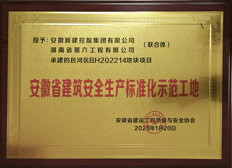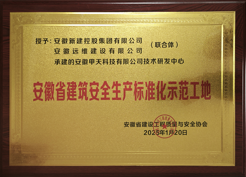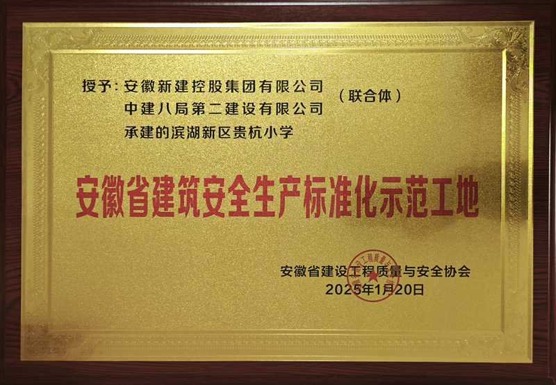 近日,安徽省建设工程质量与安全协会颁发2024年度安徽省建筑安全生产标准化示范工地牌匾证书,集团公司联合承建的滨湖新区贵杭小学、安徽甲天科技有限公司技术研发中心、包河区BH202214地块项目三项工程喜获殊荣。