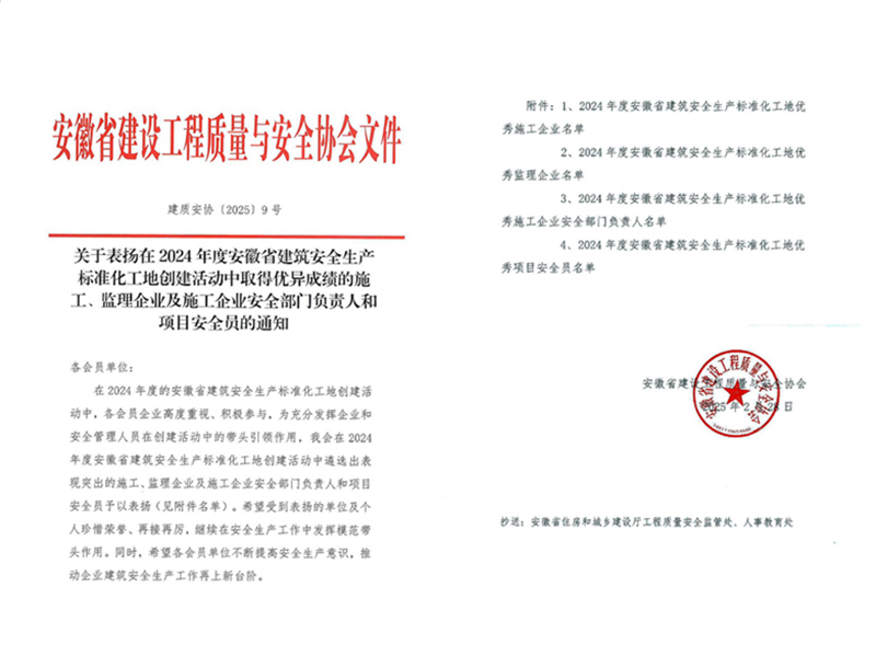 近日,安徽省建设工程质量与安全协会发布表扬通知,集团公司荣获“安徽省建筑安全生产标准化工地优秀施工企业”称号,公司多名安全管理人员获得表彰。