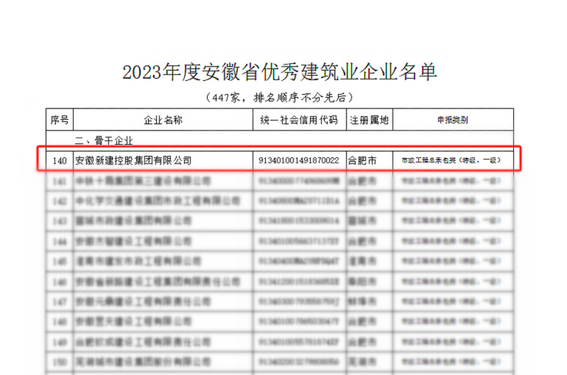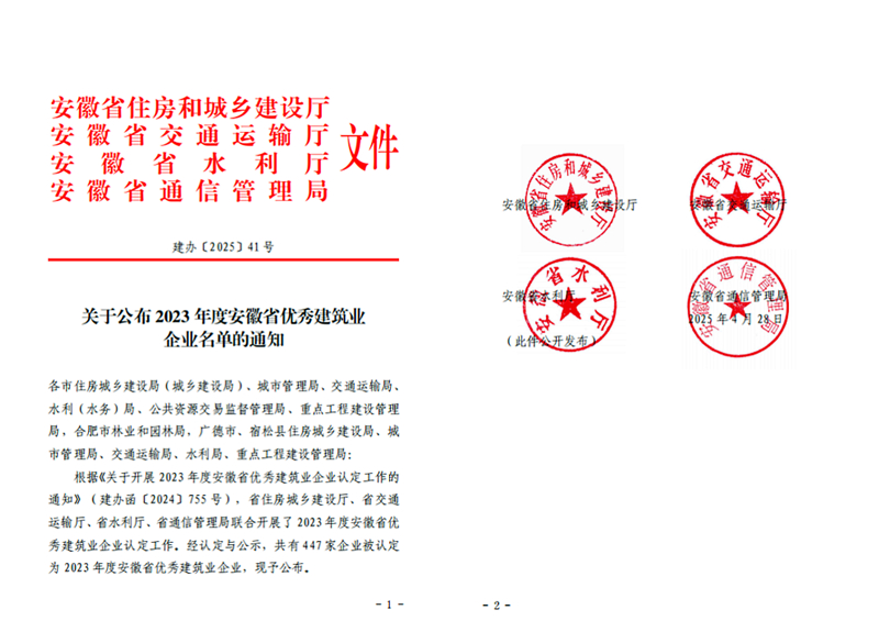 近日,安徽省住房和城乡建设厅、省交通运输厅、省水利厅、省通信管理局联合公布"2023年度安徽省优秀建筑业企业"名单。集团公司凭借非凡实力,被认定为“安徽省建筑业骨干企业”,并连续四年荣获“安徽省优秀建筑业企业”称号!