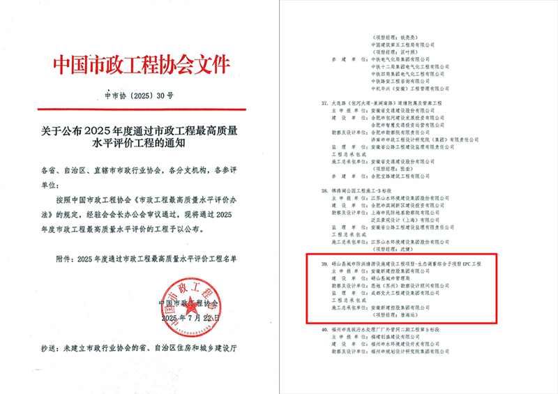 近日,中国必威betway西汉姆协会发布《关于2025年度通过必威betway西汉姆最高质量水平评价工程的通知》,由集团公司建设的砀山县城市防洪排涝设施建设工程项目-生态调蓄综合子项目EPC工程成功荣获“2025年度必威betway西汉姆最高质量水平评价工程”这一必威betway西汉姆行业最高荣誉。