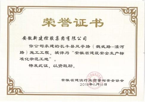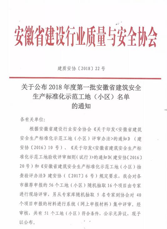 近日,安徽省建设行业质量与安全协会公布了2018年度第一批安徽省建筑安全生产标准化示范工地(小区)名单,由我公司承建的凤亭路(魏武路-濛河路)项目荣登榜单!