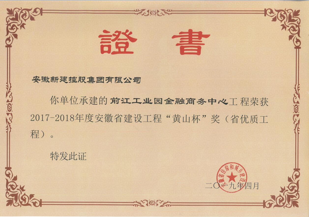 日前,由我公司承建的池州市前江工业园金融商务中心项目喜获2017-2018年度安徽省优质工程“黄山杯”!