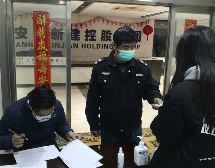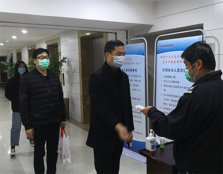全员复工第一天,集团总部疫情防控领导小组的成员已经早早来到集团公司,在办公楼大门处设立体温检测岗,对戴口罩返岗的每一位员工认真检测体温并做好记录,体温合格的员工还要对手部进行消毒才能进到办公区域。