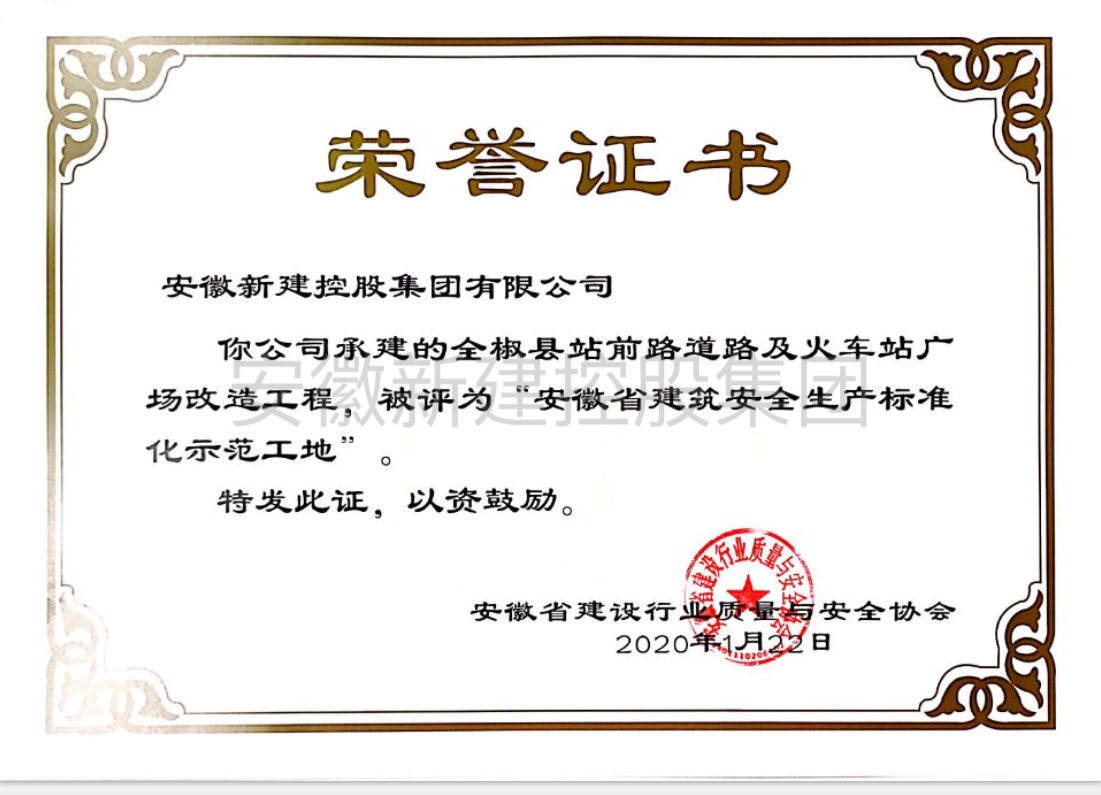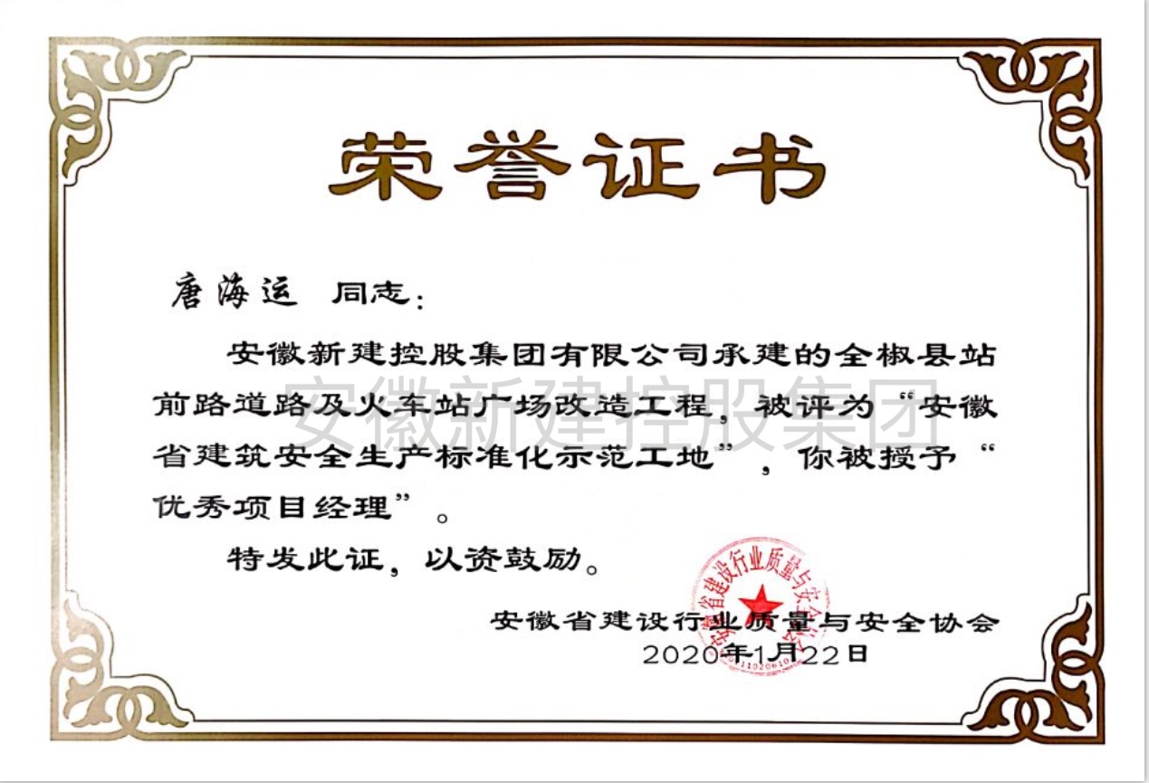 近日,我公司承建的全椒县站前路道路及火车站广场改造工程,通过安徽省建设行业质量与安全协会的严格考评,被评为“安徽省建筑安全生产标准化示范工地”称号。唐海运获“优秀项目经理”称号。